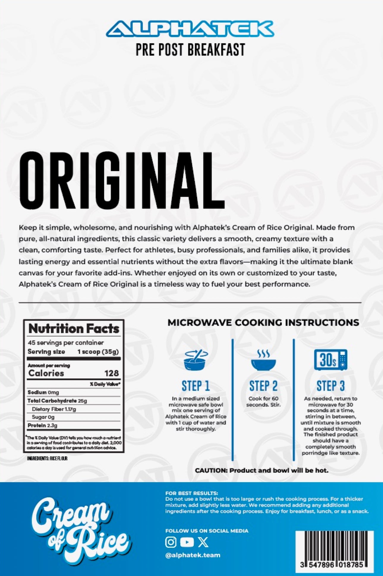 Keep it simple, wholesome, and nourishing with Alphatek's Cream of Rice Original. Made from pure, all-natural ingredients, this classic variety delivers a smooth, creamy texture with a clean, comforting taste. Perfect for athletes, busy professionals, and families alike, it provides lasting energy and essential nutrients without the extra flavors-making it the ultimate blank canvas for your favorite add-ins. Whether enjoyed on its own or customized to your taste, Alphatek's Cream of Rice Original is a timeless way to fuel your best performance.